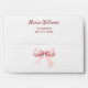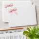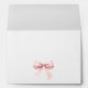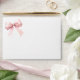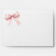 White background. Personalize and add a name and your return address. The name is written with a modern and trendy handlettered style script. Decorated with a pink bow.