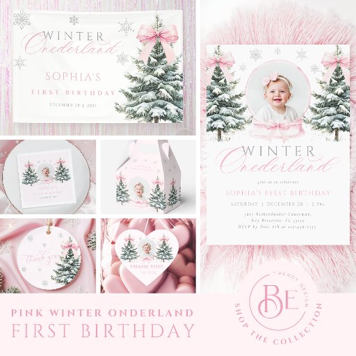 Add a sweet winter touch to your party table with these elegant napkins featuring snow-covered trees and a soft pink bow. Perfect for a Winter Onederland first birthday celebration. Personalise with your child’s name and date for a charming custom detail.