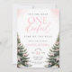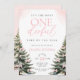 Pink Bow Winter Onerderland Girl 1st Birthday Invitation with pine trees and pink bow details.
