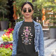 Boho and rustic women's t-shirt featuring hand drawn illustration of bows and flowers in pink and purple.