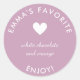A simple sticker for wedding favours with "Bride's favourite" written in white on a simple pink background. The idea is that you use these stickers to decorate your wedding favours by giving, for example, two candy bars or miniature bottles of alcohol which are the favourites of the wedding couple. This would also work well to decorate His/Her favourite cocktail, as part of a candy buffet or to decorate cupcake/dessert boxes. You can change the background colour to whatever you want and you can change the text to match the item you're using, including your preferred spelling of 'favourite'. You can also change the "enjoy" to a small message of thanks or delete it entirely to make more space to describe your item. You can also change the name to "Bride's favourite" or "Her favourite" if you prefer.