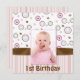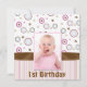 Adorable baby's first birthday party invitation, done in a trendy colour scheme of, brown, tan, pink, and blue. Fun hand designed patterns of stripes and polka dot circles as a background, with a square area photo field, for your baby's picture. Personalise all the text front and back for your child's memorable birthday party.