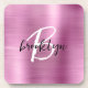 This elegant personalised coaster features a monogram and first name in modern black and white script on a pink brushed metal background.