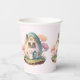 Paper cups with an adorable image with a round shaped bunny standing outside it's egg-shaped house. Pastel colours and cherry trees add to the Japanese kawaii vibe.