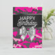 Custom birthday card with "Happy birthday" in mixed typography, silver bow, black satin ribbon, and pink camouflage background.