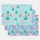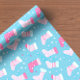 Pink pastel colourful holiday wrapping paper with cute items such as candy canes, stockings and presents on blue and teal backgrounds.
