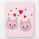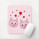 A pair of cute happy pink cats, with red love hearts, on a pink heart pattern background.