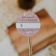 Chic round stickers with a blush pink champagne bokeh background display three lines of custom text (shown with your boutique name and website) and a black field for hand writing prices. If bulk ordering stickers for certain price points, use the Customise function to add your pre-printed price.