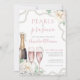 Soft blush pink rose champagne takes centre stage, accented by delicate strands of cascading white pearls that frame the invitation, adding a luxurious and whimsical touch. Watercolor elements include a champagne bottle and glasses, subtle bubbles for a festive flair, and soft blush pink peonies with greenery, creating a fresh and romantic vibe.