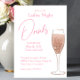 This custom invitation features a glamourous Ladies Night Cocktail party theme. The party information is printed in a soft pink font, with the "Drinks" title printed in an elegant script. A glass of sparkling rose champagne is placed on the right. Pink glitter confetti accents the bottom portion.