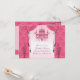 The stage is set for an elegant shower for the bride-to-be. Pink heavy damask curtains are pulled back to reveal an ornate chandelier. Tall vases of roses frame the text to invite guests to the bridal shower. The reverse shows the drapery with the chandelier pulled up out of the way to highlight all the details of the elegant event. Available in alternate colours with matching products.