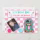 Retro colours make this the perfect bowling themed birthday party invitation. The background contains pink and white chequered pattern. There is a pink and blue retro jukebox in the lower right hand corner. A tilted framed area to add a photo of the birthday girl or boy in the lower left hand corner with bowling pins and pink and blue bowling balls. Across the top is a white area with pink trim and two bowling balls. There is text in blue and pink retro style font, fully customisable to suit your needs. The text area and photo frame area look to be taped on. The reverse side of the invitation has the same pink and white chequered background with a large white area with pink trim for your customised text.