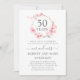A pretty and elegant wreath of pink cherry blossoms surrounds 50 years to top off this 50th wedding anniversary party invitation. The text is a combination of modern calligraphy and classic upright text. The grey colour compliments the cherry blossoms.