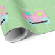 A cute design featuring pink choo choo trains with fun color accents. A whimsical green background with random circle designs.