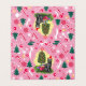This is a beautiful, playful, joyous pink Christmas design. It features an illustration of a black cat with a Christmas tree and a pattern of candies, tiny green trees, snowflakes and shooting stars floating around.