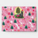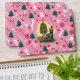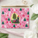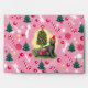 This is a beautiful, playful, joyous pink Christmas design. It features an illustration of a black cat with a Christmas tree and a pattern of candies, tiny green trees, snowflakes and shooting stars floating around.