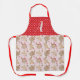 This adorable apron features a pink pinstriped background with gingerbread, chocolate cookies, star sugar cookies, and peppermint candies. Top has a red and white polka dot pattern. Personalise with an initial.