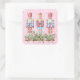 Utilise these colourful square stickers on envelopes, party favours, gifts and more! A glorious pink background holds a trio of nutcrackers that stand on Christmas evergreens. Two different sizes available to choose from.