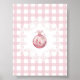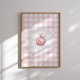 Classic holiday poster featuring a hand-painted red ornament with ribbon and greenery, set against a pink gingham check background. Perfect festive wall decor for Christmas celebrations, seasonal parties, or farmhouse holiday style.