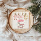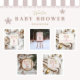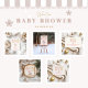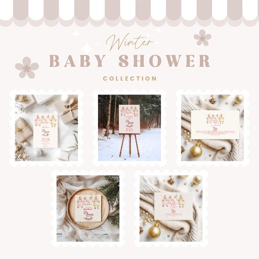 This festive baby shower design features cosy pink winter outfits hanging on twine, accented with pine sprigs and golden bows. Below, a hand-painted vintage rocking horse adds a playful holiday touch. The soft watercolor palette and charming details create a warm and magical setting to welcome a baby girl during the Christmas season.