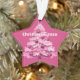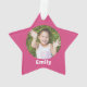 Ornament for a child with photo and year date. Pink Christmas tree design on the front of a star-shaped ornament, with round photo template on the back. Add the child's name beneath the photo.