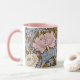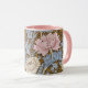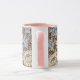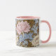 A floral coffee mug with pink and white chrysanthemums and curled foliage digitally restored from a pattern by William Morris (1834-1896), the British textile designer from the arts and crafts period.