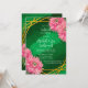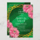 A delicate watercolor illustration featuring a gold geometric frame set against an emerald green background. The frame is adorned with vibrant hot pink chrysanthemums placed along the outer edges. The entire design has a soft watercolor texture, blending elegance with a natural floral touch.