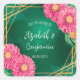 A delicate watercolor illustration featuring a gold geometric frame set against an emerald green background. The frame is adorned with vibrant hot pink chrysanthemums placed along the outer edges. The entire design has a soft watercolor texture, blending elegance with a natural floral touch.