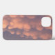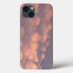 The image on this iPhone 13 Case is an original photograph by ZoeSPEAK, taken one evening as the sun set. The clouds look like puffy balls of cotton, all pink from the light of the setting sun. Even the blue sky has a pinkish tint. A touch of yellow tints the cloud band closer to the sun.