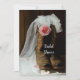 Invite guests to your casual yet classy ranch theme pre marriage party honoring the bride to be with the charming Pink Country Rose and Cowboy Boots Bridal Shower Invitation. This informal and elegant custom country western Wedding Shower Invite features a quaint floral photograph of brown leather cowboy boots filled with a pink rose flower blossom with a bridal veil and barn wood on white satin.