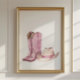 Infuse your decor with western flair using our Cowgirl Boots and Hat Print, showcasing watercolor cowgirl boots and a hat in soft pink and beige hues.