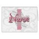 Pink swirly Nurse text, with a pink cross and white and grey swirls in the background. A lovely gift for the new nurse, nursing school student or professional with a nursing or medical career at a hospital or doctor's office. Very pretty and feminine design. All Designs Copyright © 2012 www.CuteComfy.com