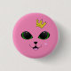 This round pink button features a cartoon cat face with a small gold crown on its head. The cat has big green eyes, a small pink nose, and a small pink heart on its cheek. The background is a solid pink colour.