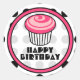 A sticker featuring an illustration of a hot pink cupcake surrounded by a matching frame. Customisable text reads "Happy Birthday." Background is black polka dot. Look for matching items such as invitations in the "Birthday Shop" category of The Pink Schoolhouse store.
