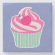 Graphic art / illustration of a yummy pink cupcake with swirls of icing on top and a cute, hot pink, polka dot cherry. The base is green and white stripes. Purple background.