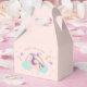 Personalised magical rainbow unicorn gable favor box in light pink background. Girly, cute and fun.