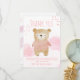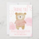 This adorable baby shower thank you card features a sweet watercolor illustration of a sleeping teddy bear dressed in a cosy soft pink sweater, nestled among fluffy pastel clouds and delicate pink hearts. The charming design combines woodland charm with gentle, soothing colours, perfectly capturing the warmth and joy of welcoming a baby girl. The playful "Thank You" text in matching pink adds a stylish and heartfelt touch, making it the ideal way to express gratitude to friends and family after your special celebration.