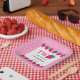 Adorable and sweet kids birthday paper plate featuring cute pink strawberries. Ideal party supplies for girl's birthday celebration.