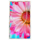 A bright pink daisy against a bright blue background. The sides of the bag are decorated with patterned water colour polka dots.