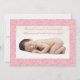 The text and baby photo on this pink gerbera daisy baby girl photo birth announcement are fully customisable. The back of this invitation shows the newborn photograph with a nice quote. This quote can be changed or removed using "personalise it", or the position of it changed in "customise it". Also, the baby photo and front text can be changed using "personalise it". The baby photo can also be made larger in "customise it" and you may prefer to fill the whole back with the picture of your beautiful baby girl. To do this, make sure to use a photograph that is 5"x7" in size. The back is meant to put the focus on the image of your new beautiful baby girl, rather than the text or design.