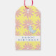 This design has a fun pink daisy pattern over a bright yellow background. Sitting on top of the of the text, is the little blue bird. On the back there's an area for your message. Type font and colour can be customised.