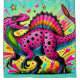 This shower curtain has a pink dinosaur design on it.