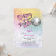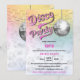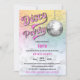 © Socialite Designs Inc. & LICENSORS. Celebrate a disco birthday party by inviting the guests with this fun, retro disco birthday party invitation. Colors are silver, white, hot pink glitter and gray. The design incorporates a silver disco ball and white string lights, with bokeh as a background.