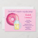 A sweet and delicious birthay party invitation. Set on a girl pink polka dot background. Illustrated with a yummy illustration of a pink frosted doughnut with colourful sprinkles and a refreshing glass of lemonade.