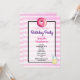 A fancy whimsical and sweet birthday party invite. A pink and white striped background. Layered over top is a semi-transparent overlay with a black border. A pink glazed doughnut with sprinkles at the top and a glass of refreshing lemonade at the bottom. Personalise with your party details.
