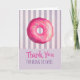 A thank you card with a yummy illustration of a pink frosted doughnut with colourful sprinkles. Set on a shabby viontage pastel purple striped background. The text says "Thank You for being so sweet".