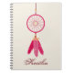 A spiral notebook featuring an illustration of a pink dream catcher with pink feathers. Personalise with your name.