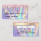 A stylish and trendy credit card style business card. This design features faux glittery pink drips over a faux holographic pastel rainbow background.
