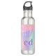 A trendy rainbow unicorn coloured, holographic background colours in pink, purple, mint green. Decorated with drips in pink and purple. Personalise and add a name and monogram initials,  purple coloured letters.