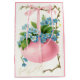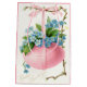 A huge, pink Easter egg with tiny, blue flowers is hanging by a thin, pink ribbon. Message: Easter Greetings. Image of a Vintage Easter Postcard with a custom light pink background.